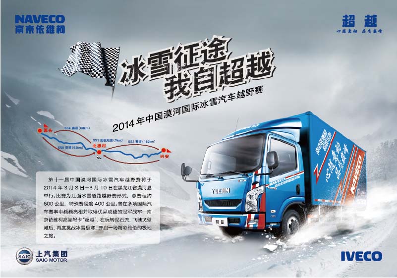 第十一届中国漠河国际冰雪汽车越野赛将于2014年3月8日-3月10日在黑龙江省漠河县举行。比赛为江面冰雪道路越野赛形式,总赛程约600公里,特殊赛段逾400公里。曾在多项国际汽车赛事中频频亮相并取得优异成绩的冠军战车-南京依维柯高端轻卡“超越”,在玩转泥石流,飞驰戈壁滩后,再度挑战冰雪极寒,开启一场精彩绝伦的极地之旅。