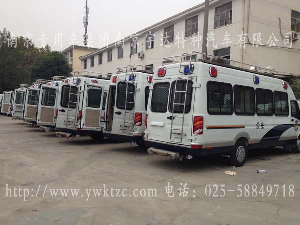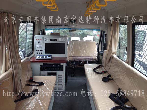 配有警灯凸台及红蓝LED长条警灯,四周车窗防爆防护网,并配有逆变电源、DVD、功放、液晶显示