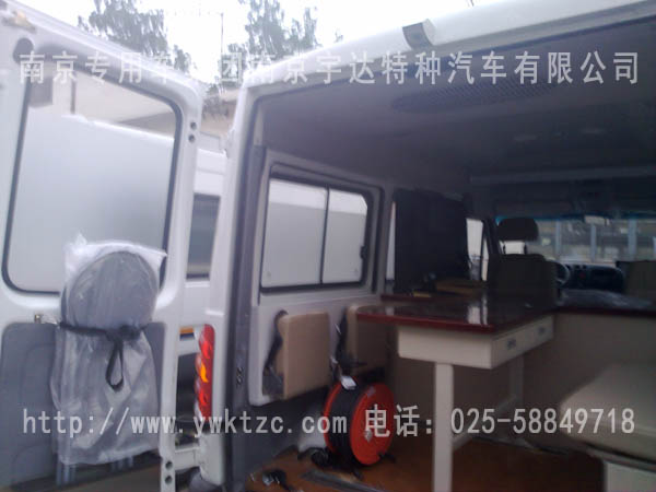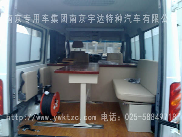 上掀门及车体改造,车身左侧共2扇上掀门,门采用铰链、气撑杆、依维柯专用门锁;加装后上车踏板;卷帘幕布;靠背座椅;右侧双人座椅;左侧翻版座;地面铺复合地板;前组合办公桌;后滑移带折叠办公桌,地滑轨及不锈钢固定插销、防震;资料网兜;长条红蓝警灯;喇叭SHOW 30W,安装在车顶前部;DVD,功放;液晶电视42寸,带VGA接口,用于宣传;室内照明灯;逆变电源;打印传真复印扫描一体机;UPS电瓶;半球摄像头;硬盘录像机配500G硬盘,视频采集卡;外接电源系统,车载外电接口(含30米3*2.5MM2绕线盘、YEEDA防水插、三眼插头)、电话口;电气辅助系统,;车身外观,04警蓝,有巡回审判车字样见彩页。。另客户特定宣传字样彩条另定;外翻版写字板等改装配置。