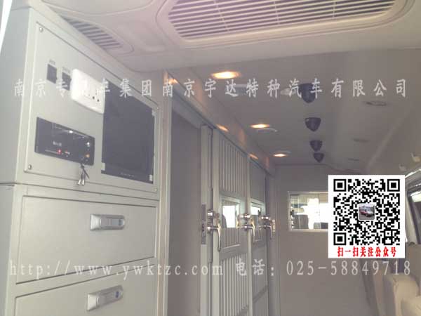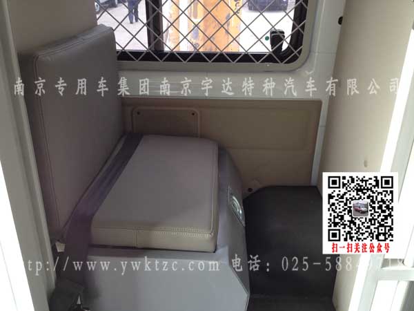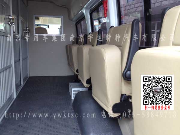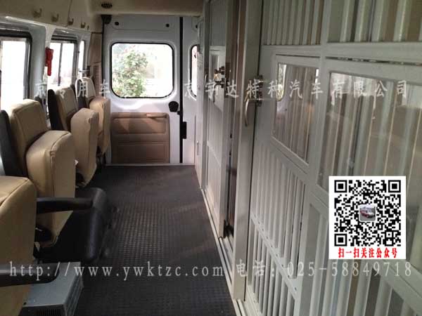 时也配备了蜗牛警灯。驾驶员后配移窗隔断,押解舱4个特制囚笼,前后软包,5个法警看护座椅,全