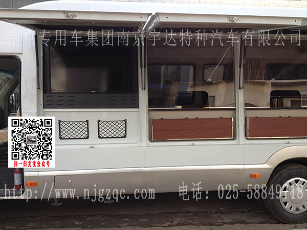 整车选装上掀门,上掀窗,全部或部分盲窗,顶置空调,工作平台,后爬梯,照明设备,喇叭,遮阳蓬,显示屏,天线,监控云台摄像机系统等。